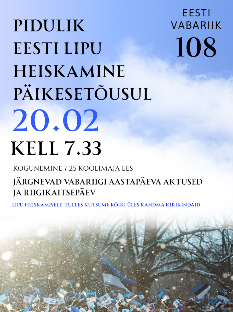 Head lapsevanemad, õpilased ja õpetajad! 20. veebruaril tähistame Eesti Vabariigi 108. aastapäeva. Ootame teid kõiki tähistama…